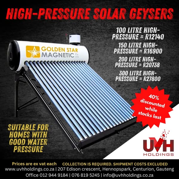 搜索关键词 solar geyser, energy saving, UVH Holdings, eco friendly, water heating, low pressure geyser, high pressure geyser, solar water heater, renewable energy, 40% discount优势 Energy Saving,Eco-Friendly,High-Pressure and Low-Pressure Options,Discount offer