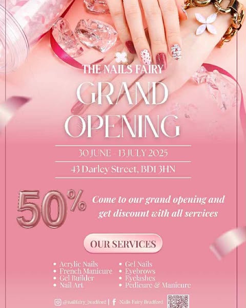搜索关键词 Nails Bradford, Bradford Nail Salon, Nail Art, Grand Opening, 50 Percent Off, Clear Skin Clinic, Beauty Services, Local Beauty, Nail Fairy, Acrylic Nails, Gel Nails优势 50% off all services for 2 weeks,New location, same quality,Partnership with Clear Skin Clinic,Wide range of nail and beauty services