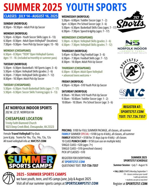 搜索关键词 youth sports, summer classes, sports programs, kids activities, Norfolk Hampton Chesapeake, affordable sports, sports757, D1 coaches, children sports class, Summer Youth Programs优势 Variety of sports classes,Multiple age groups catered for,Affordable prices,Experienced coaches,Flexible payment options (single class, monthly pass),Walk-ins welcome