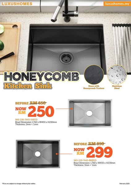 搜索关键词 kitchen sink, stainless steel sink, multifunctional sink, honeycomb sink, kitchen improvement, home renovation, affordable sink, durable sink, noise reduction, RM85 offer优势 Variety of sink options,Multifunctional design,SUS304 stainless steel for durability,Honeycomb design for strength and noise reduction,Low starting price (RM85)
