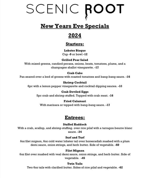 We will be serving our regular menu along with a special New Year’s Eve menu shown here and also listed on our website.