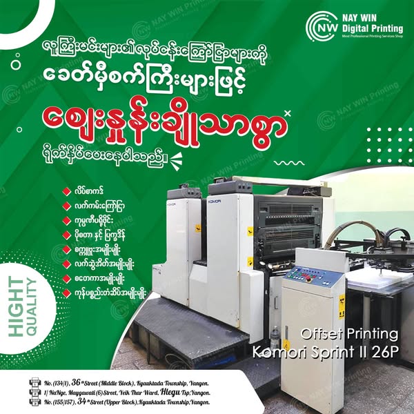 မင်္ဂလာပါရှင့်🙏လူကြီးမင်းတို့၏ လုပ်ငန်းကြော်ငြာများနှင့် ပတ်သက်ပြီး စတေကာ-ပိုစတာ နှင့် ကုန်ပစ္စည်းအမှတ်တံဆိပ် အမျိုးမျိုးတို့ကို ခေတ်မှီစက်ကြီးများဖြင့် အချိန်တိုအတွင်း ထုတ်လုပ်ရိုက်နှိပ်ပေးလျှက်ရှိသည့်အပြင် ဒီဇိုင်းအမျိုးမျိုး ရေးဆွဲဖန်တီးပေးခြင်းနှင့် လူကြီးမင်းများ၏ ရှိပြီးသား ဒီဇိုင်း Data များကိုလည်း Facebook, Viber, Email တို့မှ အပ်နှံနိုင်ပါသည်။🤝🌍🇲🇲