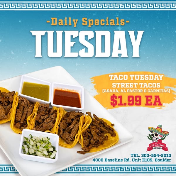 搜索关键词 Mexican restaurant Boulder, weekly specials, La Catrina, Mexican food, tacos, Baseline Road restaurant, Boulder Colorado, dine in, local restaurant, restaurant deals优势 Weekly Specials,Authentic Mexican Food,Convenient Location in Boulder, CO,Extended Operating Hours