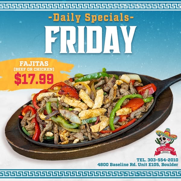 Have you seen our weekly specials yet? 🌮✨ At La Catrina Mexican Restaurant, we have deals you don’t want to miss! 😋 Come visit us at 4800 Baseline Rd Unit E-105, Boulder, CO. We’re open every day from 9 AM to 9 PM ⏰.