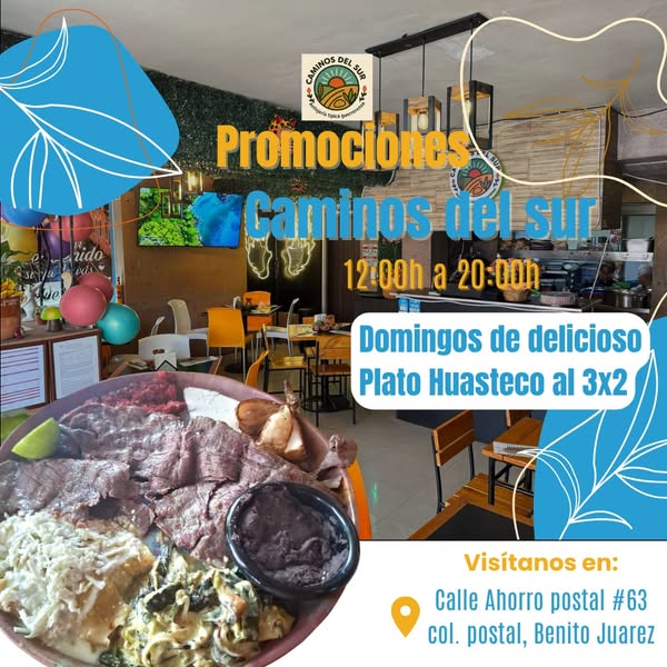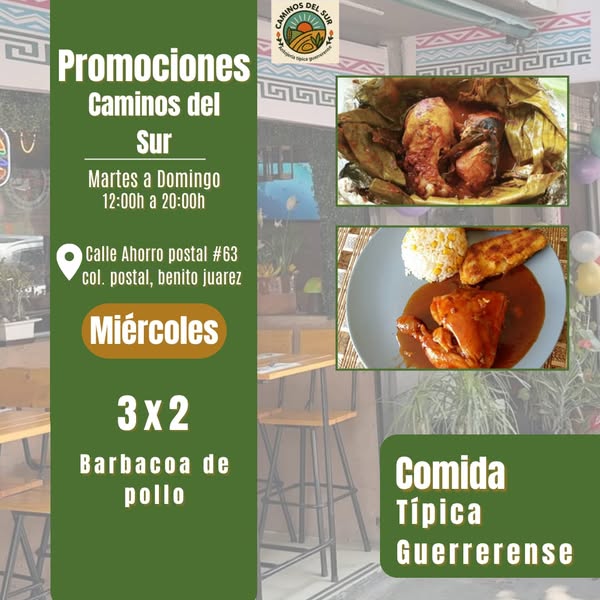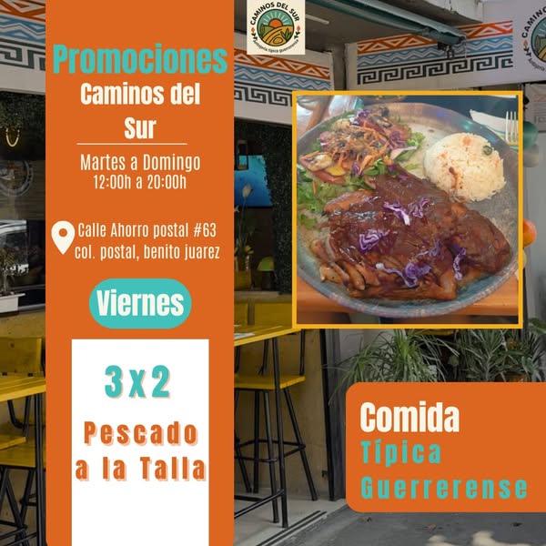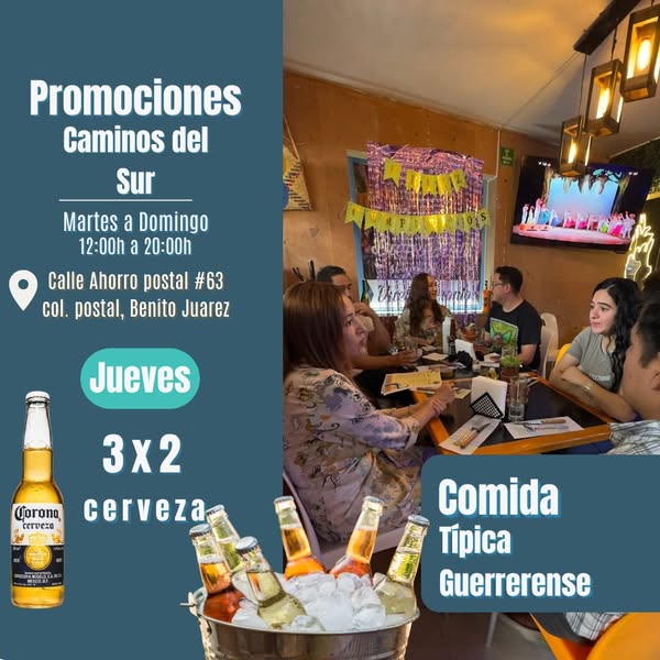 搜索关键词 Mexican food, Mexico City, Caminos del Sur restaurant, 3x2 promo, pozole restaurant, Guerrero food, seafood restaurant, metro Villa de Cortés, best food, good restaurant优势 3x2 promotion on all menu items,Authentic Guerrero flavors,Convenient location near metro