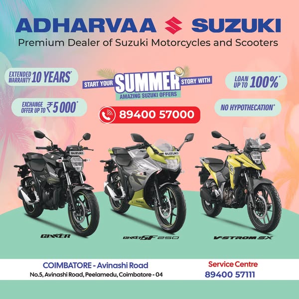 Celebrate this summer with unbeatable Suzuki offers! Get up to ₹5000 exchange bonus, 100% loan approval, no hypothecation, and an extended 10-year warranty. Visit our Avinashi Road showroom in Coimbatore or call +91 89400 57000 to book now.