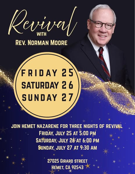 搜索关键词 Hemet Revival, Norman Moore, religious event, church gathering, spiritual awakening, community worship, love feast, Hemet Nazarene Church, faith healing, religious service优势 Spirit-filled gatherings,Renowned speaker Dr. Norman Moore,Multi-generational worship,Love Feast and community building,Welcoming and inclusive atmosphere