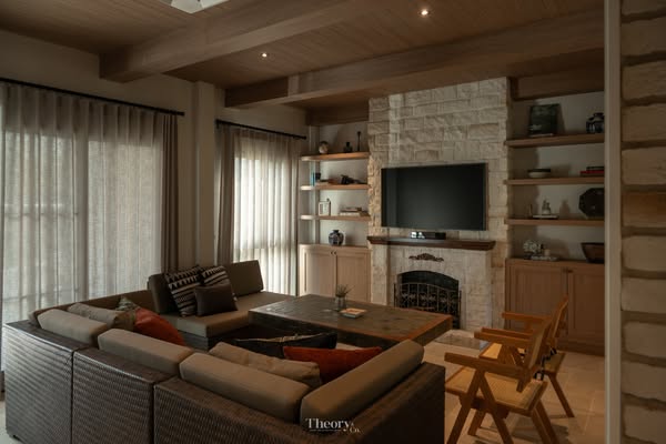 วัสดุแต่ละชิ้นถูกเลือกมาอย่างตั้งใจ — ทั้ง หินสีขาวรอบเตาผิง, พื้นกระเบื้องลายหิน, และ ฝ้าไม้ระแนง ที่เปิดโปร่งและดูสบายตา ทุกอย่างช่วยสร้างบรรยากาศที่ดูเรียบแต่มีดีเทล และใช้งานได้จริง