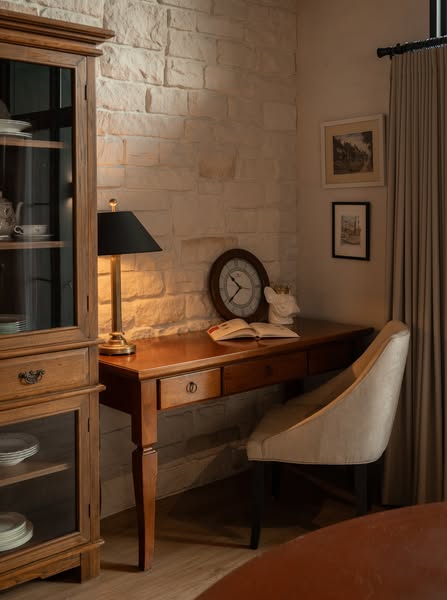 What makes this home truly special are the little things filled with meaning: art painted by the homeowner, ceramic teacups collected from travels, and sunlight filtering through soft linen curtains during the day. Come evening, brass pendant lights cast a cozy golden glow throughout.