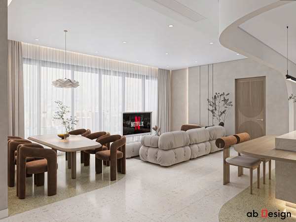 Dự án thiết kế cải tạo căn hộ với màu nâu kem nhẹ nhàng làm diệu mắt, không gian mở liên kết phòng khách – bếp – ăn giúp tối ưu diện tích, tạo cảm giác rộng rãi, kết nối, gần gũi nhưng không kém phần sang trọng. Mỗi chi tiết nội thất đều được chọn lọc tinh tế, kết hợp ánh sáng tự nhiên và chất liệu gỗ – vải – đá để mang lại cảm giác thư giãn, hiện đại và đậm dấu ấn cá nhân.