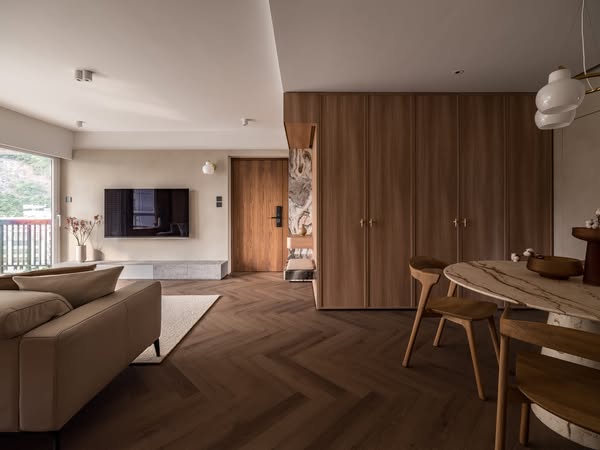 In the heart of Repulse Bay, a family residence has been elegantly transformed to cater to the evolving needs of a young family. Previously designed by the same team, the couple's residence has been reimagined in light of the arrival of new family members and shifts in their lifestyle. The reimagined living space now features an open living and dining room alongside three bedrooms, with the design core revolving around the interplay of materials and textures. Soft neutrals, chiefly beige and white, dominate the colour palette, while oak-finished walls harmonise with dark herringbone walnut floors. This serene backdrop is animated by the luxurious texture of marble, a nod to the couple's preference for natural textures, evident in the sleek marble backboard behind the sofa and the beige marble dining table.