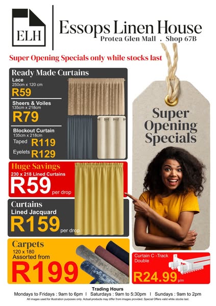 Protea Glen, it’s official! Essops Linen House is now open, offering exceptional opening specials from Friday to Sunday.