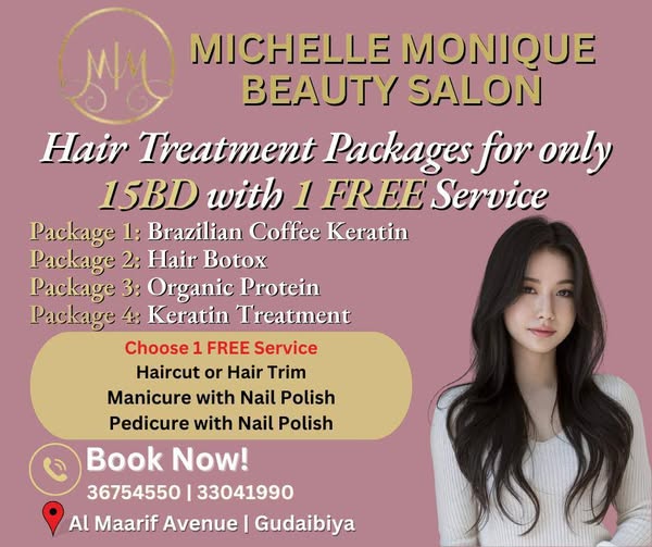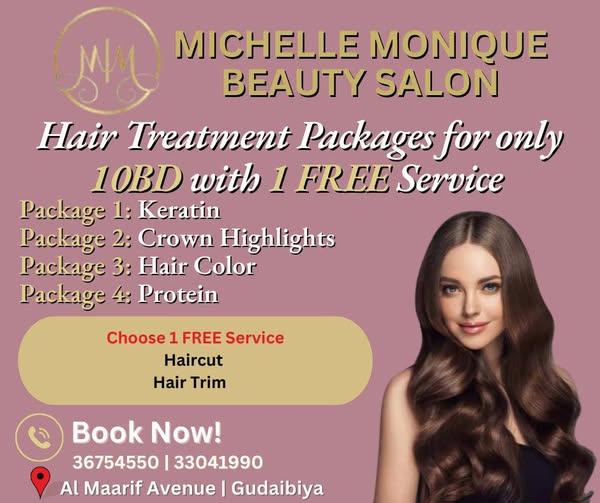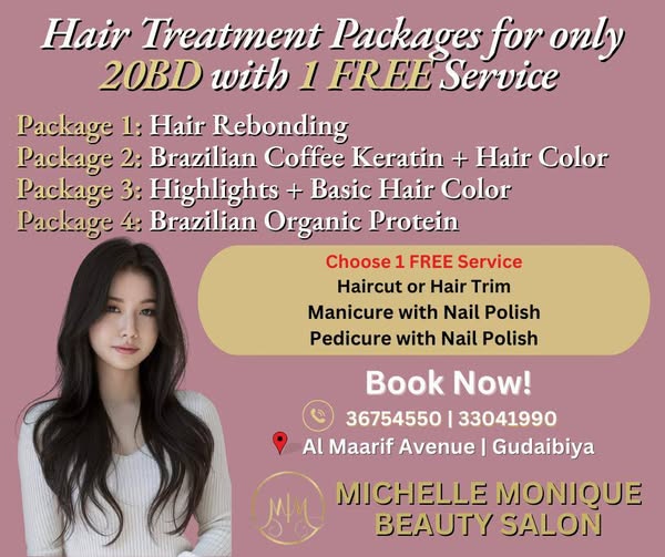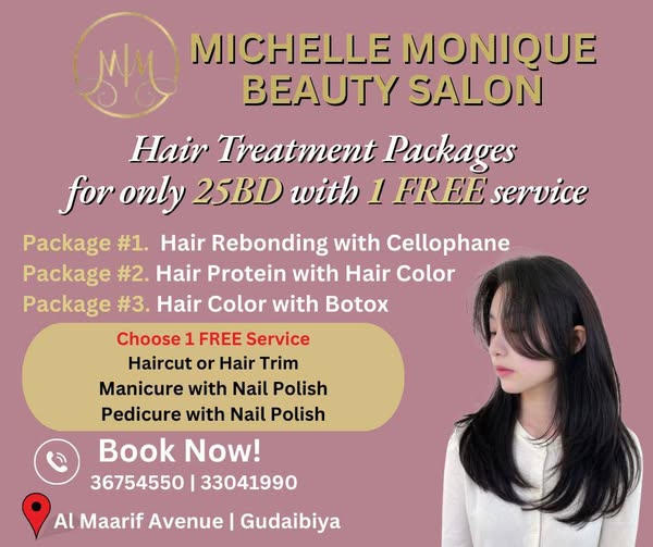 搜索关键词 Beauty Salon Bahrain, Hair Promo, Affordable Hair, Michelle Monique, Hair Treatment, Gudaibiya Salon, Filipina Hair, Cheap Hair Salon, Quality Hair Service, Hair Appointment优势 Affordable Price,Quality Service,Promo Discount
