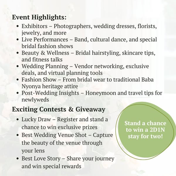 搜索关键词 wedding fair Melaka, bridal fashion show, Dusit Princess wedding, wedding deals Malaysia, bridal event 2025, wedding planning services, wedding inspiration, bridal goodie bag, timeless celebrations, wedding exhibitors优势 Exclusive deals on wedding services,Chance to win a hotel stay,Bridal fashion show,Live entertainment,Meet top wedding exhibitors,Light refreshments