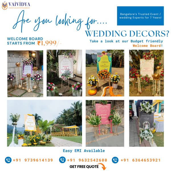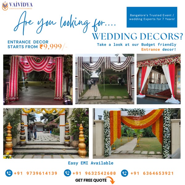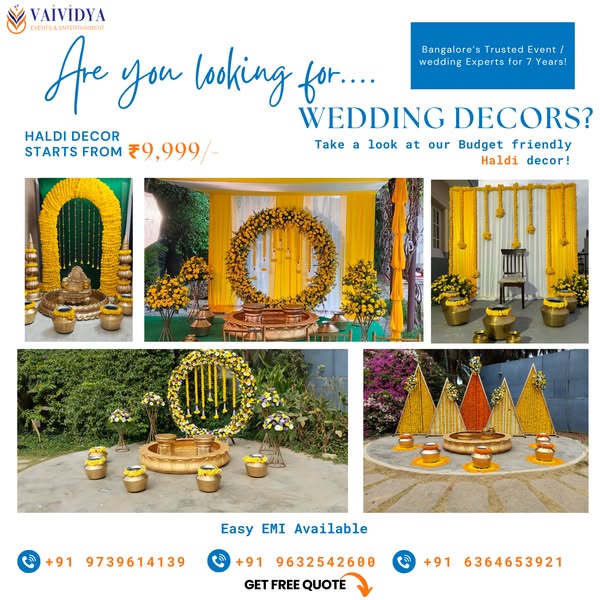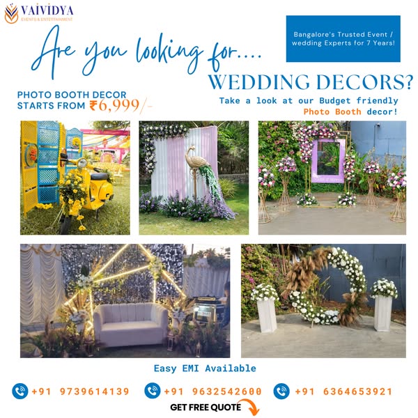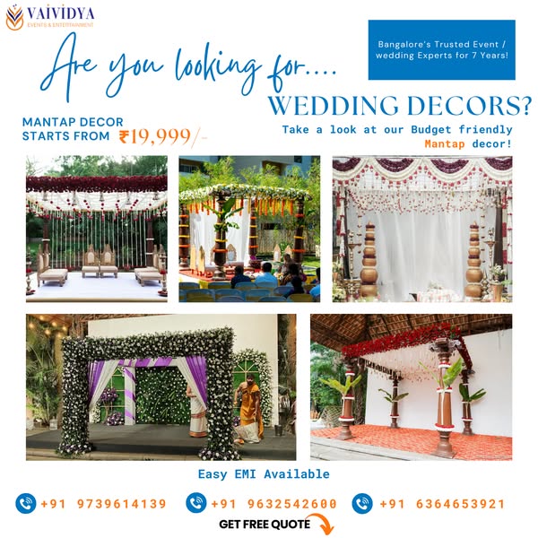 Planning your big day? Let Vaividya Events & Entertainment turn your vision into reality! From weddings to haldi, photobooths to mantaps – we’ve been transforming events in Bangalore for 7+ years. ✅ Easy EMI Options ✅ Custom Decor Packages ✅ Get a Free Quote in Minutes! 📞 Call now or DM to get started with your dream event!