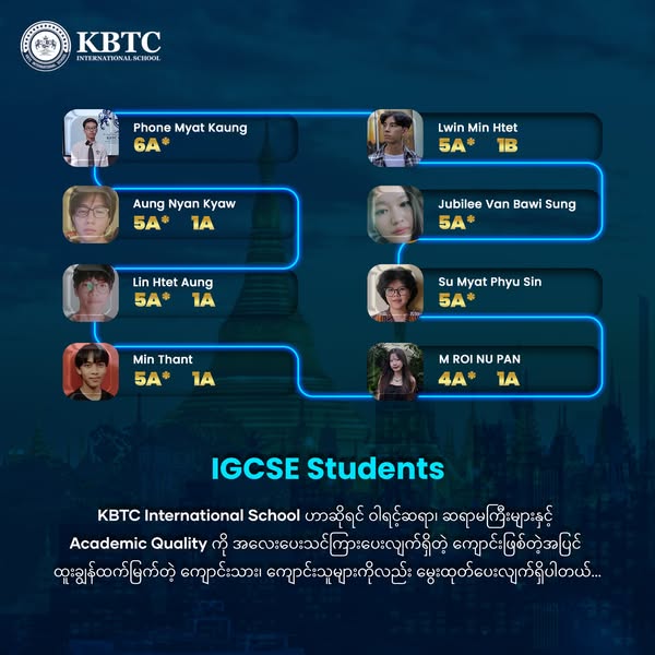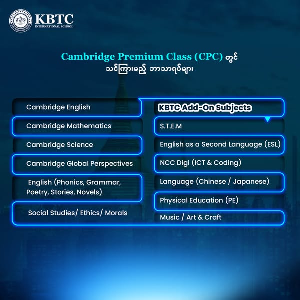 𝐊𝐁𝐓𝐂 𝐈𝐧𝐭𝐞𝐫𝐧𝐚𝐭𝐢𝐨𝐧𝐚𝐥 𝐒𝐜𝐡𝐨𝐨𝐥 ဟာဆိုရင် ကျောင်းသား၊ ကျောင်းသူတို့အတွက် နိုင်ငံတကာအဆင့်မီ ဘာသာရပ်များကို ခေတ်မီသင်ကြားရေးနည်းစနစ်များဖြင့် သင်ကြားပေးလျက်ရှိတဲ့ ကျောင်းတစ်ကျောင်းဖြစ်ပါတယ်။ ဘက်စုံထူးချွန်တဲ့ ကျောင်းသား၊ ကျောင်းသူများကို နှစ်စဥ်မွေးထုတ်ပေးလျက်ရှိတဲ့ 𝐊𝐁𝐓𝐂 𝐈𝐧𝐭𝐞𝐫𝐧𝐚𝐭𝐢𝐨𝐧𝐚𝐥 𝐒𝐜𝐡𝐨𝐨𝐥 ဟာ နိုင်ငံတကာပညာရေးလမ်းကြောင်းကို အခြေခံအုတ်မြစ်ခိုင်မာစွာဖြင့် တက်လှမ်းလိုသူများရဲ့ ရွေးချယ်မှုအများဆုံး ကျောင်းတစ်ကျောင်းလည်းဖြစ်ပါတယ်။ ✔