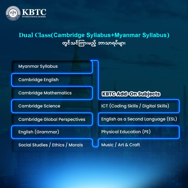 搜索关键词 International School Myanmar, Cambridge Curriculum, Quality Education, KBTC School, Dual Class, Kandawgyi Campus, Education for Future, Experienced Teachers, Safe Transportation, Extra Curricular Activities优势 International standard curriculum,Experienced teachers,Cambridge Premium Class and Dual Class options,Extra-curricular activities,Modern facilities (air conditioning),Safe transportation