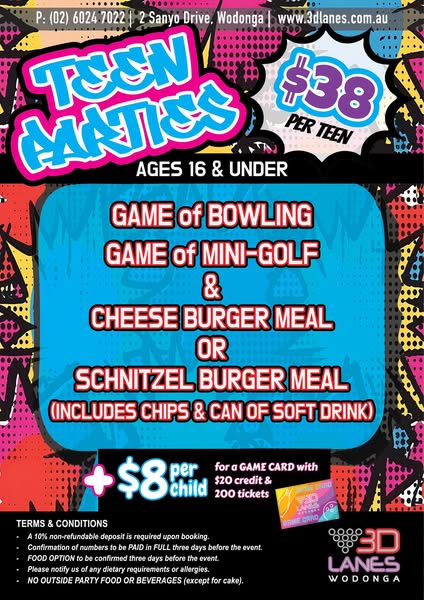 搜索关键词 Birthday Party, Bowling Party, Mini Golf Party, Kids Birthday, Teen Birthday, 3D Lanes, Party Packages, Entertainment Venue, Game Card, Party Deals优势 Variety of Activities (Bowling, Mini Golf),Catering Included,Exclusive Add-on Game Card,Suitable for Kids and Teens
