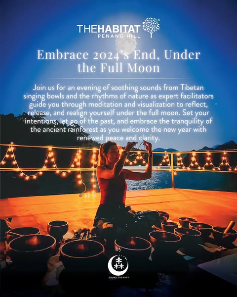 As 2024 draws to a close, join us for The Habitat Penang Hill’s newly introduced 𝐅𝐔𝐋𝐋 𝐌𝐎𝐎𝐍 𝐒𝐎𝐔𝐍𝐃 𝐁𝐀𝐓𝐇 experience. Immerse yourself under the full moon in the heart of the UNESCO Penang Hill Biosphere Reserve for an evening of 𝒓𝒆𝒇𝒍𝒆𝒄𝒕𝒊𝒐𝒏, 𝒓𝒆𝒍𝒆𝒂𝒔𝒆, 𝒂𝒏𝒅 𝒓𝒆𝒏𝒆𝒘𝒂𝒍. Guided by expert facilitators, embrace the soothing sounds of Tibetan singing bowls, wind chimes, and rain drums as you set intentions for the year ahead and let go of past energies. Surrounded by the ancient rainforest, let nature and the full moon’s energy bring you peace and inspiration for the new year. 🌿