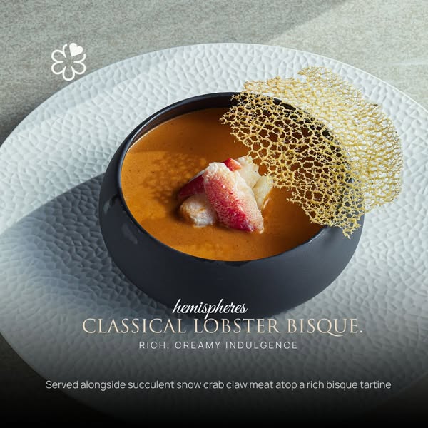 Súp tôm hùm đậm đà, sánh mịn, điểm xuyết bởi thịt càng cua tuyết ngọt chắc và bánh tartine giòn tan.