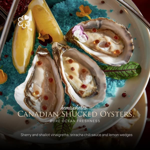 Hàu Canada tươi sống, quyện sốt giấm đỏ, hành tím, tương ớt sriracha và chanh tươi – khơi gợi vị biển thuần khiết.