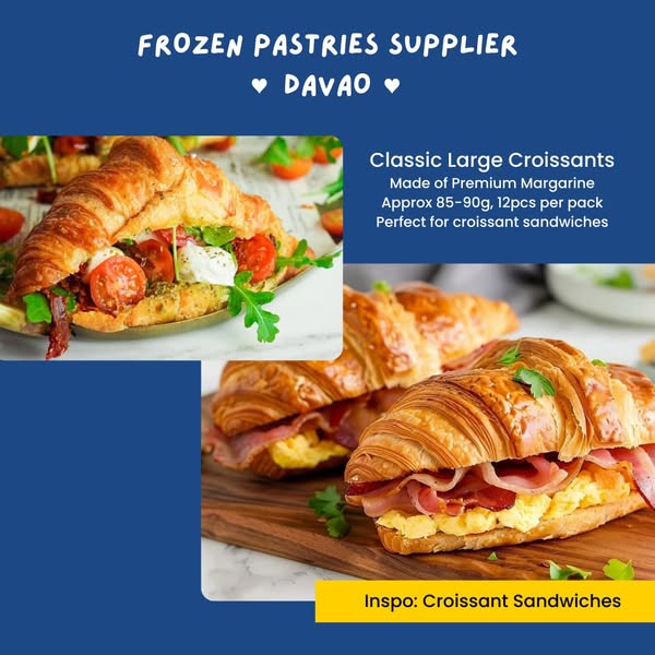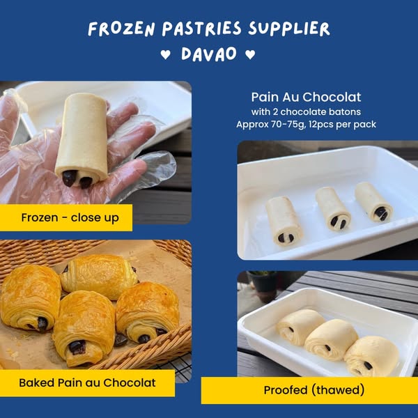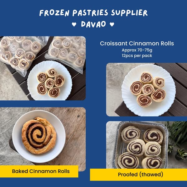 搜索关键词 frozen pastries, croissant dough, Davao pastries, Mindanao food supplier, pastries supplier, wholesale pastries, business pastries, puff pastry, cinnamon rolls, tart shells优势 Wide selection of frozen pastries,High quality pastries,Trusted by businesses,Fresh production weekly,Delivery available within Mindanao