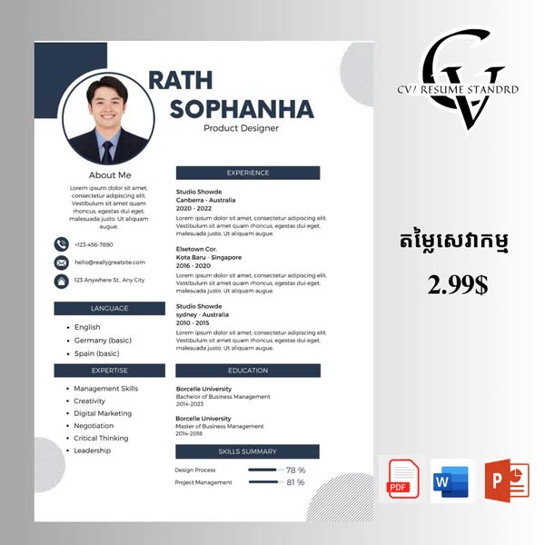 搜索关键词 CV Preparation, Resume Service, Job Seekers, Career Advice, Professional CV, CV Template, CV Standard, Cambodia Jobs, Graduate CV, Update CV优势 Professional CV Templates,Free Consultation,Customizable CV Formats,Available in PDF, Word, and PowerPoint