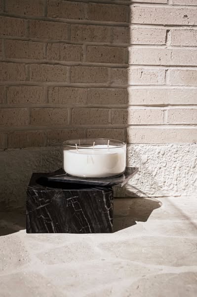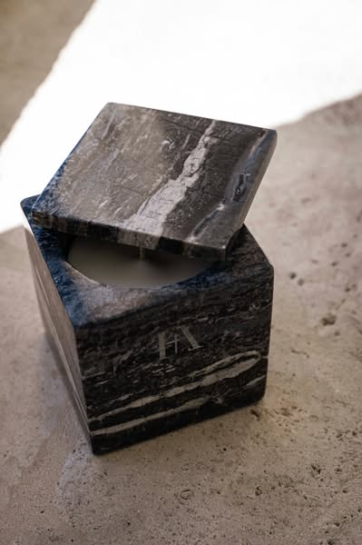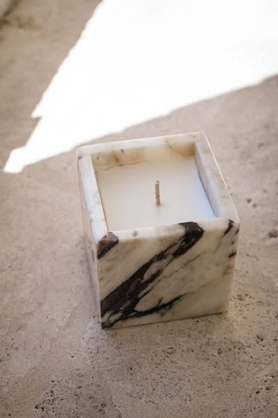 The Alabaster Candle is crafted from premium Calcutta Viola with a sleek, modern square design. It holds 2kg of wax for extended burn time and measures 20cm x 20cm x 10cm.