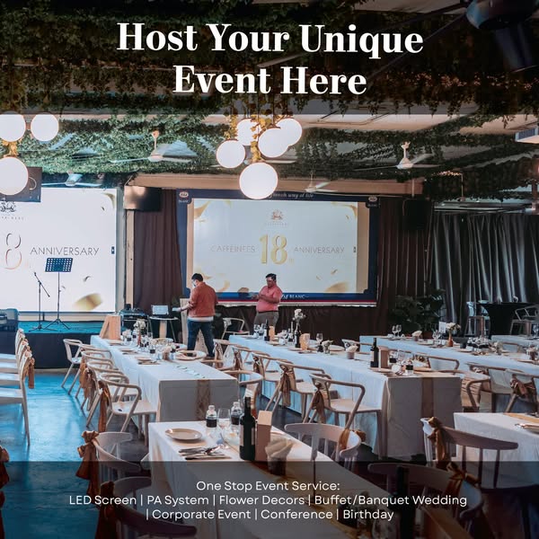 搜索关键词 free event space, Malaysia event venue, Caffeinees events, customized menus, party planning, wedding venue Kuala Lumpur, corporate event space, birthday party venue, kampung pandan restaurant, celebration event优势 Free event space with food package,Customizable menus,One-stop event service,Multiple VIP rooms and spacious halls,Comprehensive services and decorations