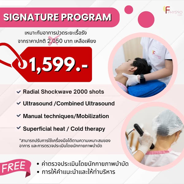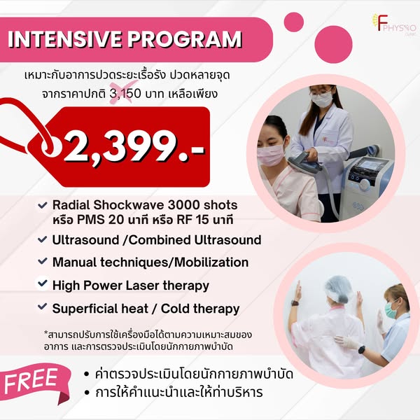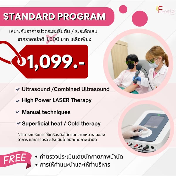 搜索关键词 physical therapy clinic, physical therapy silom, office syndrome treatment, physiotherapy promotion, injury rehabilitation, musculoskeletal pain, f physio clinic, licensed physical therapists, outpatient insurance claims, physical therapy program优势 Special price starting at 1,099 THB,Multiple physical therapy treatments included (Manual, Ultrasound, Laser, Shockwave, etc.),Evaluation and treatment by licensed physical therapists,Referral letters for outpatient insurance claims (OPD),Convenient location in Silom Edge,Credit/debit card and 0% installment options