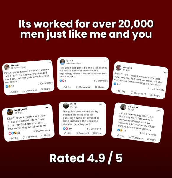 Join 24,000+ men using this proven 5-day method to build deeper desire, emotional attraction, and real connection. Crafted by experts, backed by results. Ready to see how obsessed she can be?