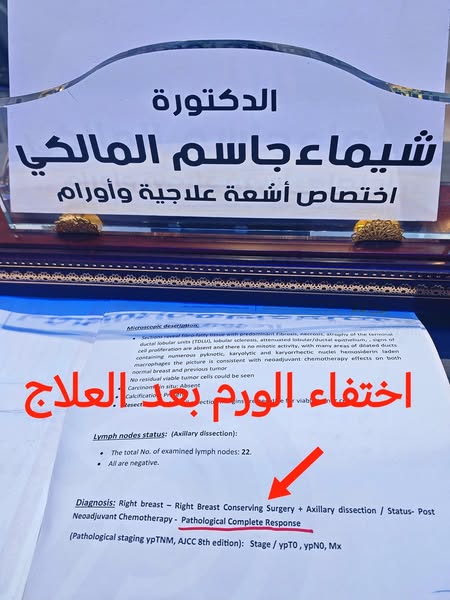 بفضل الله تعالى والمتابعة المشددة من قبل أهلها مع الالتزام بالمواعيد مع الدكتورة البارعة شيماء المالكي أخصائية معالجة الأورام والغدد الحمد لله اليوم تشافت المريضة وهي بكامل صحتها ومستعدة لإكمال رحلة العلاج الهرموني والاشعاعي..