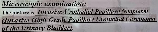 بحمد الله حالة شفاء كامل لمريض كبير بالسن يعاني من وجود الدم مع الادرار بصورة متكررة وبعد اجراء الفحوصات اللازمه تبين انه مصاب بورم المثانه النافذ الى الطبقه العضليه وبهذه الحاله يحتاج المريض الى اجراء عملية رفع المثانه ولكن المريض رفض اجراء هذه العملية..