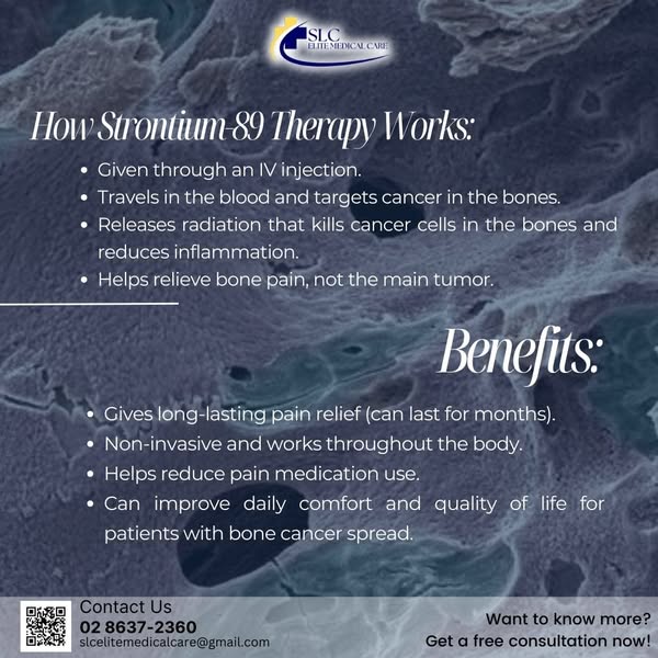搜索关键词 cancer bone pain, strontium 89, pain relief, cancer therapy, metastatic cancer, SLC Elite Medical Care, free consultation, Makati City优势 Long-lasting pain relief,Non-invasive and systemic,Reduces need for strong pain meds,Improves comfort and mobility,Manageable side effects