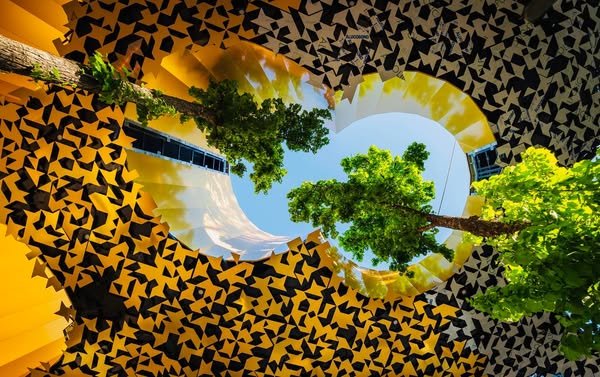 Chosen from over 150 submissions in an international competition, Fujimoto's design harmoniously blends with its surroundings. The building features a curved golden roof with irregularly shaped openings, supported by slender, tree-like columns and surrounded by transparent glass walls, creating an airy, organic atmosphere. The design has been whimsically compared to a slice of cheese, a pancake, or a mushroom, with its 80-meter diameter enhancing the natural landscape.