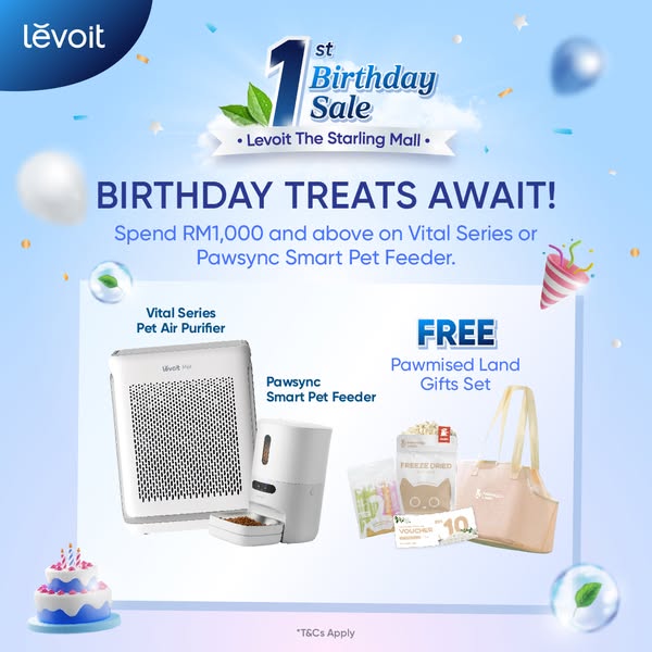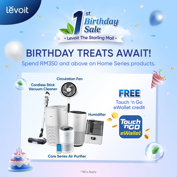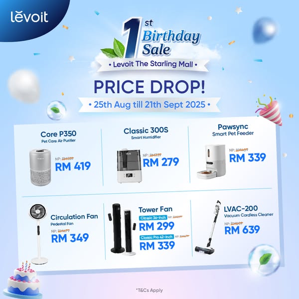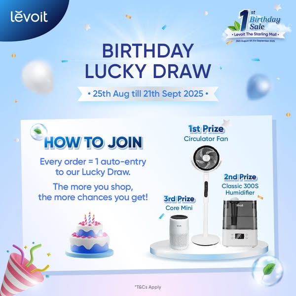 Levoit @ The Starling Mall is turning 1! Come celebrate our birthday with huge PRICE DROP on our products, FREE gifts, and LUCKY DRAW!