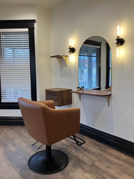 Offering beauty professionals a one-of-a-kind space that blends old-world charm with modern luxury. Our converted farmhouse-style salon features warm, inviting details like camel-colored chairs, antique brass finishes, and rich wood textures, creating the perfect upscale yet cozy atmosphere for you and your clients.