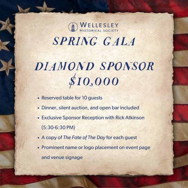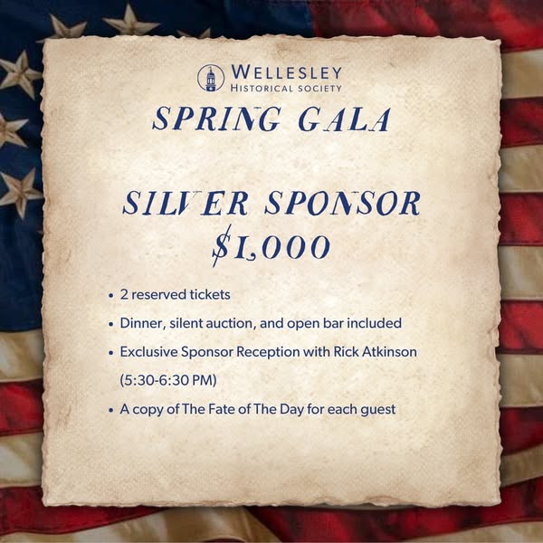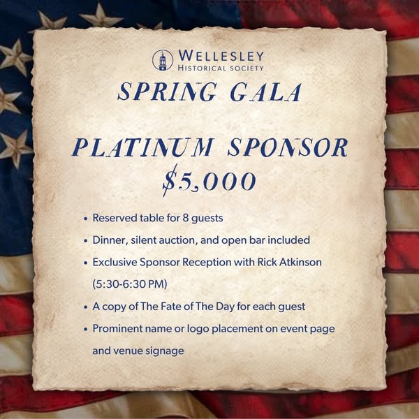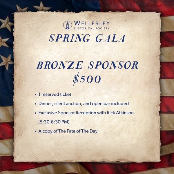 Join us at the Wellesley Historical Society’s Spring Gala on May 8! Become a sponsor today to secure your ticket early, enjoy a special reception with Pulitzer Prize-winner Rick Atkinson, and receive a complimentary book. Last year sold out—don't miss your chance! Individual tickets on sale March 18 for $195 per ticket.