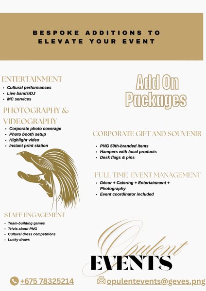 搜索关键词 PNG independence anniversary, corporate event planning, event management, golden jubilee celebration, corporate celebrations, Opulent Events, PNG events, staff celebration, milestone event, limited slots优势 One-stop shop for corporate celebrations,Comprehensive event planning services,Catering to entertainment