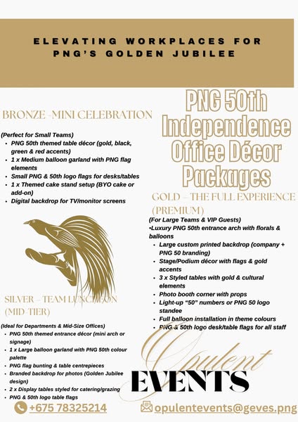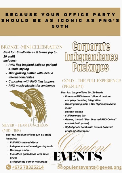 Want to give your staff a Golden Jubilee celebration they’ll never forget? 🎯 From décor to catering to entertainment, Opulent Events is your one-stop shop for September 16th corporate celebrations. It’s PNG’s 50th Independence Anniversary ,make it a milestone worthy of your team’s hard work and dedication! 🇵🇬✨
