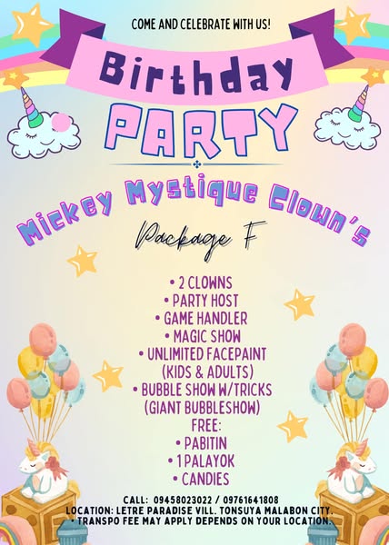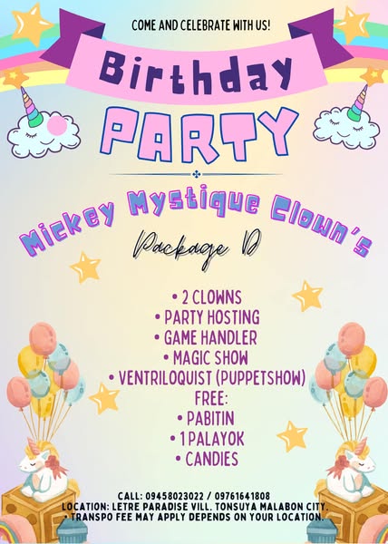 搜索关键词 kids party package, party clowns, magic show, face painting, bubble show, kids entertainment, party host, children party, party package prices, Philippines party优势 Variety of party packages,Includes clowns, magic shows, and other entertainment,Free inclusions like Pabitin and candies,Accepts any location