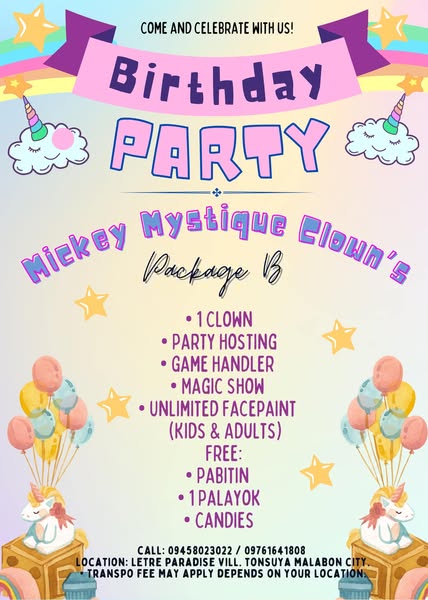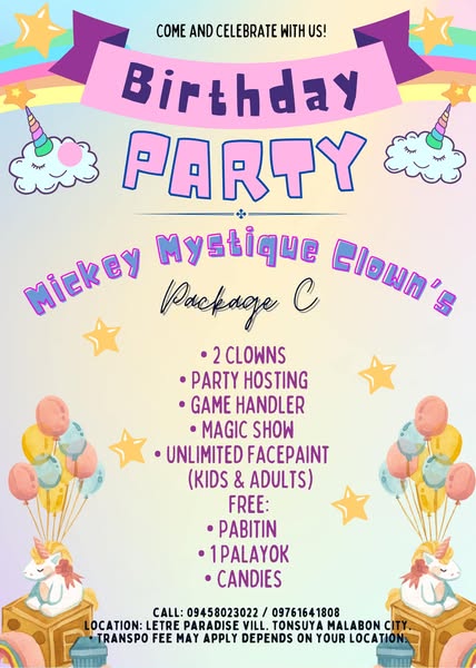 Hello, Ma'am/Sir! Are you looking for a Kid's party Package at a Good Price? Consider trying our Promo Packages, We are accepting any location!