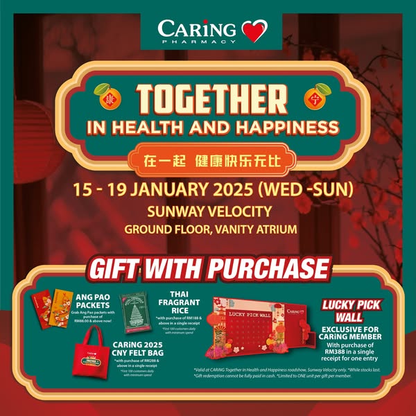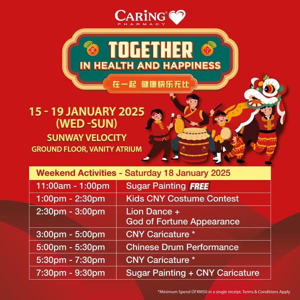 搜索关键词 Caring Pharmacy, Chinese New Year, Roadshow, Sunway Velocity, Lion Dance, Lucky Pick, Family Fun, CNY 2025, Year of the Snake, Pharmacy Deals优势 Great deals on pharmacy products,Exciting activities for the whole family,Festive celebration of Chinese New Year