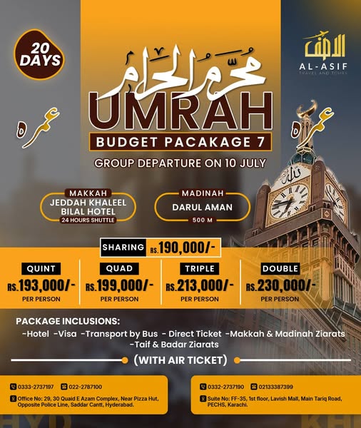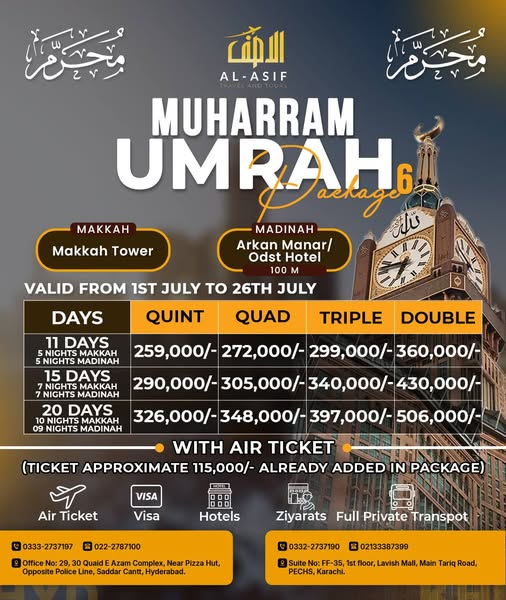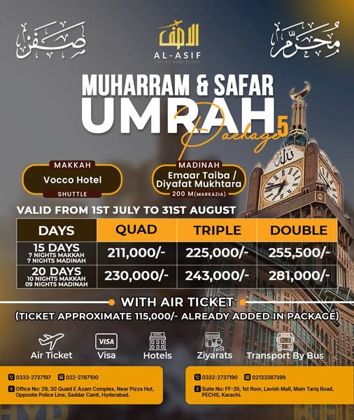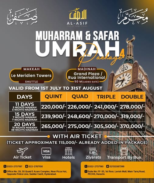 搜索关键词 Umrah Packages, Religious Travel, Makkah Madinah, Pakistan Travel, Islamic Tours, Travel Deals, Group Umrah, Al Asif Travel, Muharram Umrah, Safar Umrah优势 Comprehensive packages,Premium hotels,Guided Ziarats,Hassle-free travel