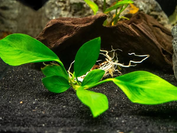Anubias Nancon is an easy-care plant that flourishes in low light. Attach it to rocks or driftwood for a lush, vibrant aquascape that’s both low-maintenance and beautiful.