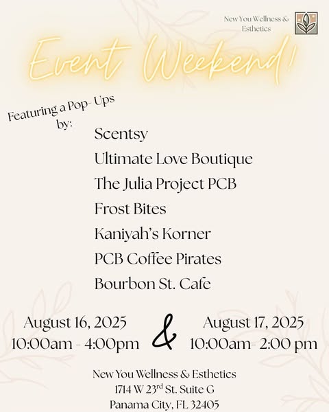 搜索关键词 wellness event weekend, beauty pop ups, botox treatments, skincare testing, panama city florida, swag bags, local vendors, pamper yourself, new you wellness, esthetics event优势 Unique pop-up shops,Walk-in Botox treatments,Skincare testing,Giveaways and swag bags,Community Engagement
