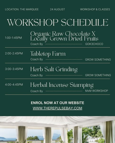 搜索关键词 wellness event, family yoga, sound bath, healthy lifestyle, organic workshop, green sunday, green sunday by the bay, herb salt grinding, herbal incense stamping, raw chocolate优势 Variety of wellness activities,Suitable for all ages,Focus on relaxation and connection,Handcraft workshop
