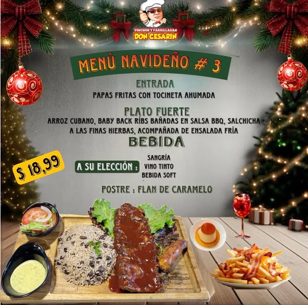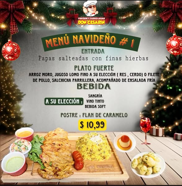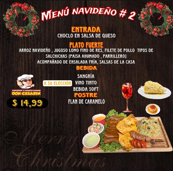 搜索关键词 Don Cesarin, Christmas menu, Ecuador restaurants, Parrilladas Ecuador, Carne Asada, Mote Pillo, Navidad 2024, Ecuadorian food, Food Delivery, Restaurant Reservation优势 Variety of locations,Convenient reservation via phone,Festive Christmas menu