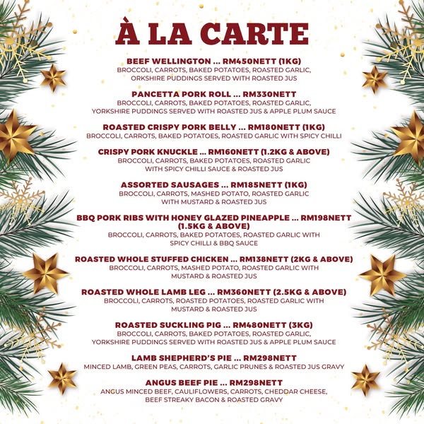 Want more options? Dive into our A La Carte menu with delicious choices like Beef Wellington and Pancetta Pork Roll to satisfy all your holiday cravings! 🎁🎉