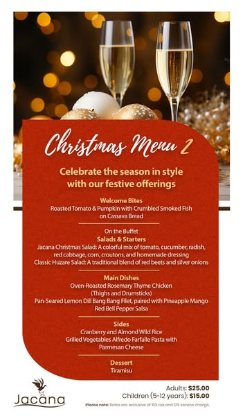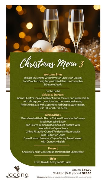 搜索关键词 Jacana Resort, Christmas menu, Suriname restaurant, holiday dining, Christmas dinner, restaurant reservation, special menu, holiday season, family restaurant, 597 restaurant优势 Exclusive Christmas menus,Multiple menu options,Easy reservation via WhatsApp, phone, or email